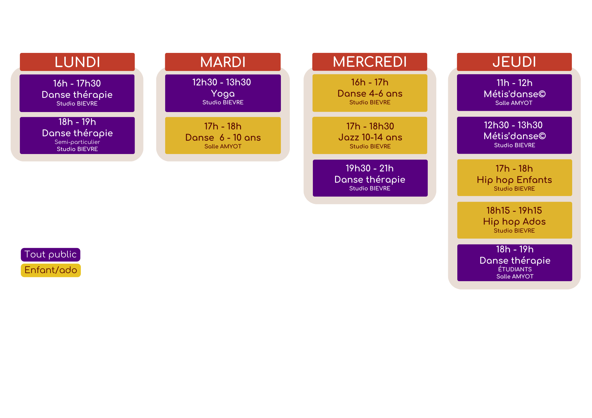 Des cours pour les jeunes débutants & confirmésDes cours de danse créative enfants & de danse Éveil pour les 4-6 ansDes cours de Modern Jazz pré-ados & ados, Des cours de Hip-Hop enfants & ados