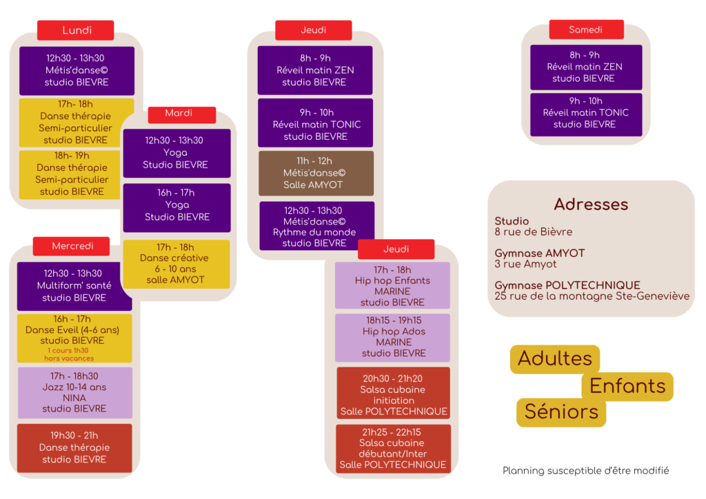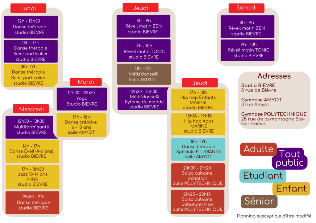 Notre école de danse, située au 8 rue de Bièvre dans le 5ᵉ arrondissement, propose un nouveau planning pour la rentrée 2025. Vous y trouverez des séances de danse thérapie, mais également des cours de danse, de gym ainsi que du yoga pour adultes et séniors. Nous offrons par ailleurs des cours de danse pour enfants.